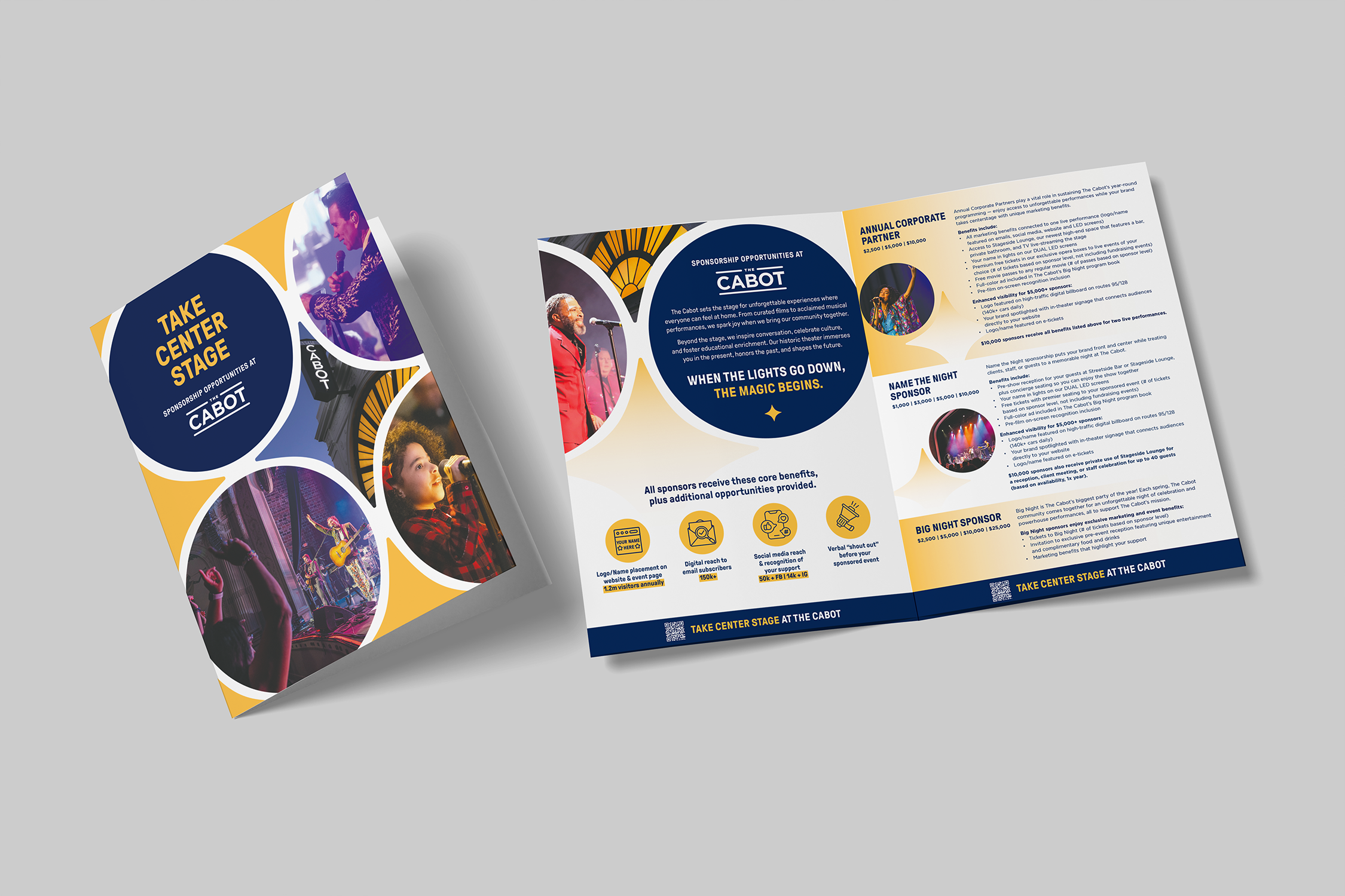 The latest campaign, Be Part of The Cabot, focuses on restoring the facade and establishing an endowment. For this effort, I designed a 12-page fundraising brochure (below) distributed at a campaign event. The piece combines infographics, a timeline, event photography, and a rendering of the proposed facade to clearly communicate the vision and impact of the campaign. An Art Deco–inspired badge on the cover references the theater’s original architectural details, tying the design back to its historic roots.